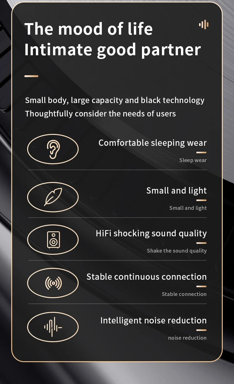 1.Thin and light on the ear: Not into the ear design—healthy design, cares for the ear canal, and will not feel pain after wearing it for a long time.